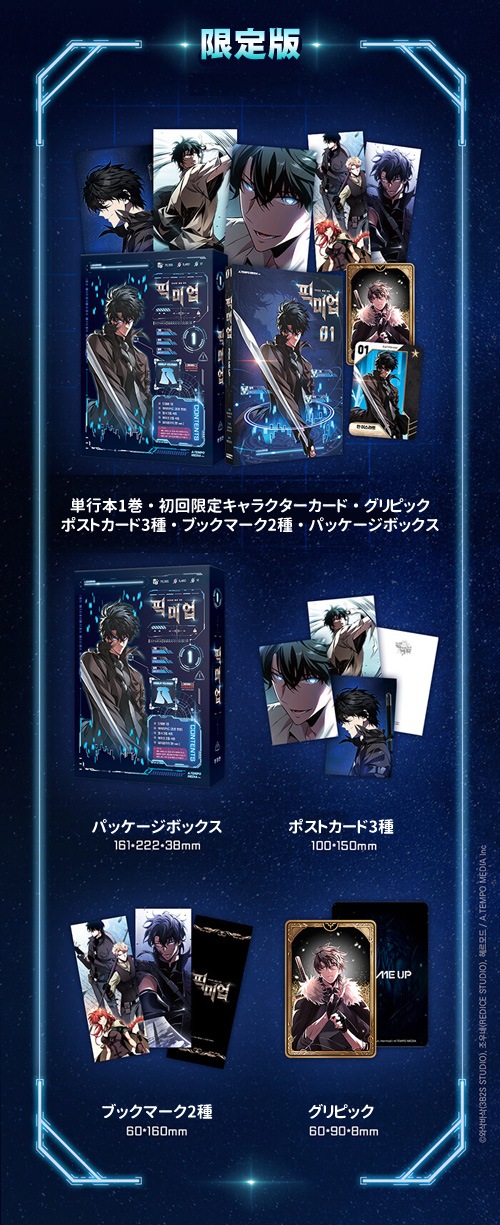 韓国マンガ PICK ME UP〜低レア★英雄の成り上がり〜 1 限定版 (初回限定キャラクターカード+グリピック+ポストカード3種+ブックマーク2種) ★商品発送完了の後の商品キャンセルの場合は往復送料が請求されますので、この点予めご了承下さい。 *パッケージボックスは商品保護用で破損による交換及び返品は致しかねます。 ■ 発刊日:2025.11.10以後 ■ 規 格:150*210 / 312P ■ 著 者:WASAK BASAK (3B2S)、nicesun (REDICE STUDIO)、Hermod ■ 出版社:エイテムポメディア ★この本は韓国語で書かれています。 ■ Book Info 極悪の難易度を誇るモバイルガチャゲーム<ピックミーアップ!(PICK ME UP!)> 世界ランキング5位のマスター「ロキ」こと、大神 柳はゲームのプレイ中に気を失ってしまう。 は? 俺がゲームキャラクターに? 目覚めると、レベル1、等級星1の英雄「ハン・イスラット」になってしまっていた「ロキ」。 地球に戻るためには初心者のマスターと英雄たちを率いてダンジョン100階を突破しなければならない! 「手を出す相手を間違えたな」 一度たりとも負けることは許されない、ハン・イスラットの強制キャリー記。 ■ 目次 1巻 : 1〜13話