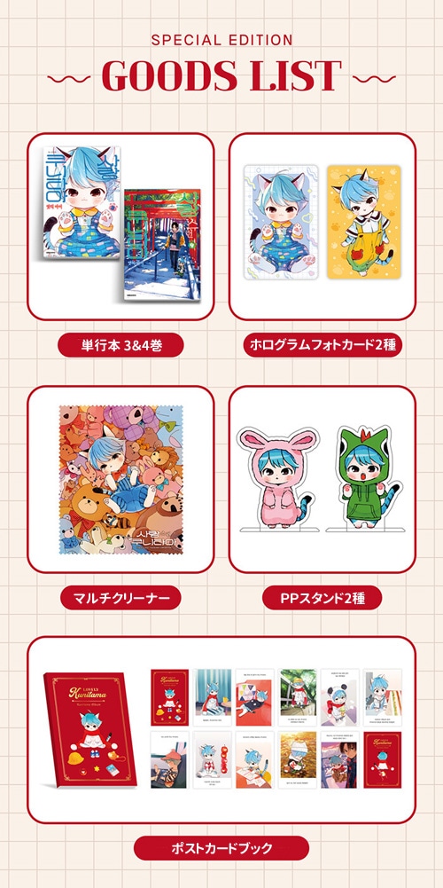(韓国語版)日本マンガ 愛しの国玉 3&4巻 特別版 (ホログラムフォトカード2種+マルチクリーナー+PPスタンド2種+ポストカードブック) ★商品発送完了の後の商品キャンセルの場合は往復送料が請求されますので、この点予めご了承下さい。 *パッケージボックスは商品保護用で破損による交換及び返品は致しかねます。 ■ 発刊日:2026.01.12 ■ 規 格:128*180 / 324P ■ 著 者:アッチあい ■ 出版社:デウォンCI ★この本は韓国語で書かれています。 ■ ご購入前の注意事項 ★ご購入前に必ずご確認ください★ ※ モニター環境により、実際の商品と色味が異なって見える場合がございます。 ※ 印刷の特性上、微細なキズやインクのムラが生じる場合がございます。 ※ 製造工程の都合上、わずかなスクラッチやインクのにじみ、裁断のズレなどが発生することがございます。 ※ 書籍の場合、紙の特性や配送過程により、微細なへこみ・しわなどが生じることがございます。 ※ アクリル素材の特性上、細かなキズ・擦れ・気泡・反りなどが見られる場合がございますが、製造上避けられないものであり、不良品・交換対象外となります。 ※ 紙製品(ポストカード、フォトカード 等)は、素材や製造工程の特性上、スクラッチやインク汚れ、斑点などが生じる場合がございます。これらは不良ではございません。 ■ Book Info 神様、国玉をオレが幸せにします。 結婚してるのにもどかしい両片想い! 「リコンリコン! 真さまとはリコンです!」 結婚相手の国玉と初詣に来た大学生・真。 「国玉をオレが幸せにします」と神様に宣言した矢先、おみくじに“浮気”の文字が…。 しかも国玉の初恋相手、真の兄・進が家に来ることに!? 一緒にお風呂に入ったり、ハンバーグを作ったり♪新婚ラブラブもたっぷりの第3巻!