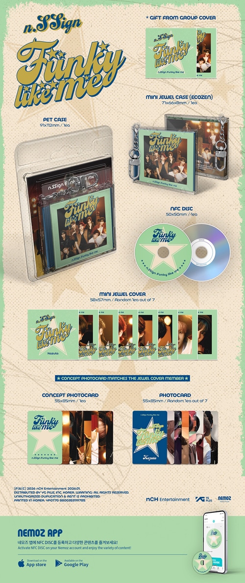 韓国音楽 n.SSign (エンサイン) - シングル 「Funky like me」 Mini Jewel Ver. (ランダム発送/NFC CD+ミニケース+ミニカバー1種+コンセプトフォトカード1種+フォトカード1種) N.SSIGN - FUNKY LIKE ME ★商品発送完了の後の商品キャンセルの場合は往復送料が請求されますので、この点予めご了承下さい。 *ミニカバー、コンセプトフォトカードのイメージはバージョンごとに異なっております。 ■ メディア:韓国盤 ■ 発売日:2026.01.22以後 ■ ジャンル:KPOP ■ 構 成:NFC CD+ミニケース+ミニカバー1種+コンセプトフォトカード1種+フォトカード1種(全7種の中1種ランダム) ■ Album Info *この商品はCDを含まない商品です。 *Platform Albumとは何ですか? CDやフォトブックなどが各種封入された従来のアルバムとは全く異なる新しい形式の商品です。 環境への影響が懸念されるアルバムパッケージ資材の利用を最小限に抑え、 フォトカードとデジタルコンテンツで構成されており、アプリを通じ音楽や様々なコンテンツを楽しむことができる次世代アルバムです。 *ネモ カード 取扱説明書 ネモ アルバムはカード型スマートアルバムです。 ネモアルバムは、Nemozアプリを通じてNFC、ネモコード、QRコードの3つの方式でアルバムを正規品認証します。 最初の一度だけ認証すれば、アカウントにネモアルバムが登録され、音楽、映像、画像などを自由に利用できます。 アルバム発売後もコンテンツが継続的にアップデートされ、お気に入りの高画質イメージを自分のスマートフォンにダウンロードできます。 ■ Track List DISC1 (Platform Album) 01. Funky like me (Feat. PEAK & PITCH) 02. Beautiful Monster 03. SCOOT UP!