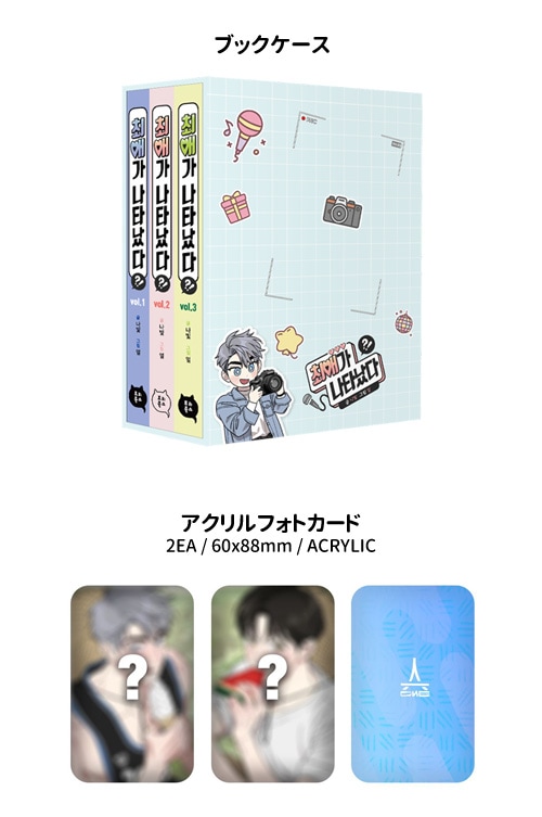★クーポン使用例外商品★ [ファンディング] 韓国マンガ 「推しが現れた!?」 単行本&限定グッズ プロジェクト (予約 発売日:2025.12.31以後) ※製作社の事情によって製品情報や特典内容、発売日が変更されることがありますのでこの点予めご了承下さい。 ※予約商品と一般の商品を一緒にご注文になった場合は、予約商品が入荷した後にまとめて配送致しますので、ご了解お願い致します。 ★商品発送完了の後の商品キャンセルの場合は往復送料が請求されますので、この点予めご了承下さい。 ■ 発売日:2025.12.31以後 ■ 商品名:「推しが現れた!?」 単行本&限定グッズ プロジェクト ■ 選 択:単行本SET、FULL SET ■ Goods Info [ファンディング期間 2025.10.01 ~ 2025.10.31 12時まで] 単行本SET : 単行本1〜3巻+ブックケース+ブックカード13種 FULL SET : 単行本1〜3巻+ブックケース+ブックカード13種+アクリルカード2種+アクリルスタンド+アクリルキーリング+スケジュール表