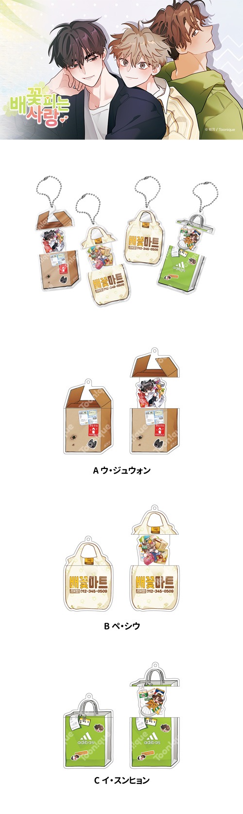 [特典贈呈] 韓国キャラクターグッズ 「ペアブロッサム・ラブ」 プルアップ アクリルキーリング (3種1択) (予約 発売日:2026.03.31以後) ※製作社の事情によって製品情報や特典内容、発売日が変更されることがありますのでこの点予めご了承下さい。 ※予約商品と一般の商品を一緒にご注文になった場合は、予約商品が入荷した後にまとめて配送致しますので、ご了解お願い致します。 ★商品発送完了の後の商品キャンセルの場合は往復送料が請求されますので、この点予めご了承下さい。 ☆この商品は銀行振り込みやカード決済など先払いで決済して頂いてから商品発送になります。 ■ 発売日:2026.03.31以後 ■ 商品名:「ペアブロッサム・ラブ」 プルアップ アクリルキーリング ■ 素 材:ACRYLIC ■ サイズ:53x80mm ■ 選 択:A ウ・ジュウォン、B ペ・シウ、C イ・スンヒョン ※ 大量生産のため、多少の印刷ずれ、裁断ミス、小さな埃などが発生する場合があります。 ※ 光の反射で確認される微細な傷や押し跡などは不良ではありません。 ※ 紙製品(フォトカード、ポストカードなど)の場合、素材の特性上、製造工程でスクラッチや傷、点などが生じることがあります。 ※ アクリル素材の特性上、細かなキズ・擦れ・気泡・反りなどが見られる場合がございますが、製造上避けられないものであり、不良品・交換対象外となります。 ※ 背景紙およびOPP袋は製品を保護するための包装材であり、配送過程で破れが発生する場合がありますが、交換・返品の対象外となります。 ☆ ご注意☆ ★ イメージ写真と実際の商品とは色合いなど少し違う場合もあります。