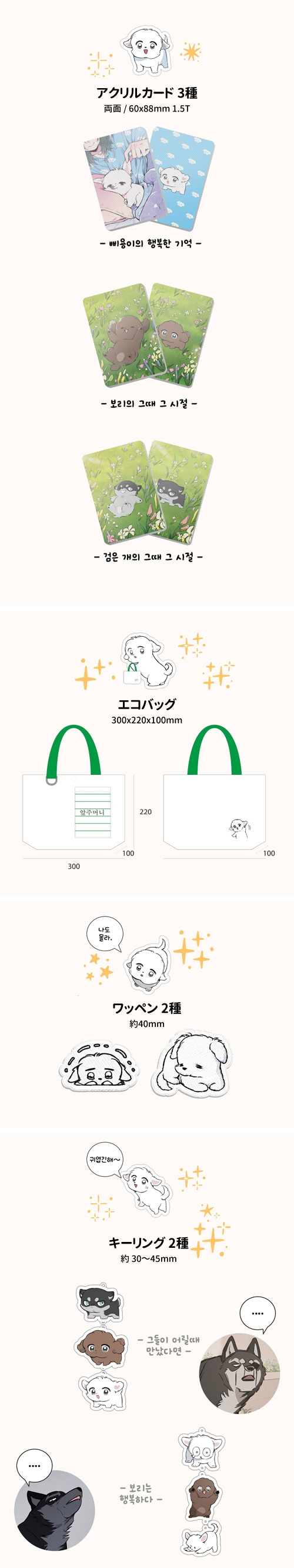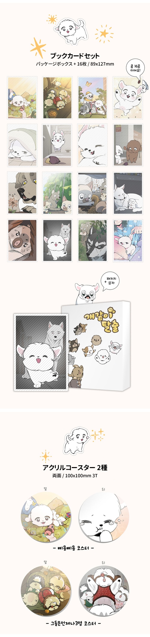 ★クーポン使用例外商品★ [ファンディング] 韓国マンガ 「犬のように脱出」 単行本1〜3巻&グッズ (予約 発売日:2026.06.19以後) ※製作社の事情によって製品情報や特典内容、発売日が変更されることがありますのでこの点予めご了承下さい。 ※予約商品と一般の商品を一緒にご注文になった場合は、予約商品が入荷した後にまとめて配送致しますので、ご了解お願い致します。 ★商品発送完了の後の商品キャンセルの場合は往復送料が請求されますので、この点予めご了承下さい。 ■ 発売日:2026.06.19以後 ■ 商品名:「犬のように脱出」 単行本1〜3巻&グッズ ■ 選 択:A〜G SET、FULL SET、 ■ Goods Info [ファンディング期間 2026.04.06 ~ 2026.05.01 12時まで] *単行本 シーズン1 1話〜46話収録 A SET : 単行本1〜3巻+ブックケース+ブックカードセット B SET : A SET + ワッペン2種 C SET : A SET + アクリルコースター2種 D SET : A SET + アクリルカード3種 E SET : A SET + エコバッグ + ワッペン2種 F SET : A SET + キーリング2種 G SET : A SET + エコバッグ + キーリング2種 FULL SET : 単行本1〜3巻+ブックケース+ブックカードセット+コースター2種+アクリルカード3種+エコバッグ+ワッペン2種+キーリング2種